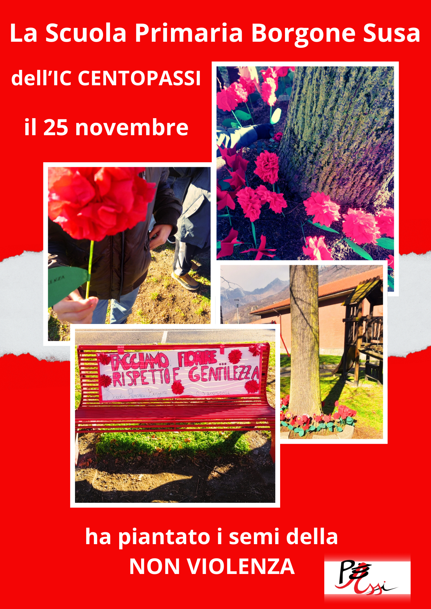 In occasione delle iniziative dedicate alla promozione del rispetto e alla sensibilizzazione contro ogni forma di violenza, i tre ordini di scuola dell’Istituto Comprensivo Centopassi hanno scelto di unirsi attraverso un simbolo semplice e potente: i fiori rossi, emblema della femminilità, della delicatezza e del valore unico di ogni persona, che mai deve essere sfiorata dalla violenza.
