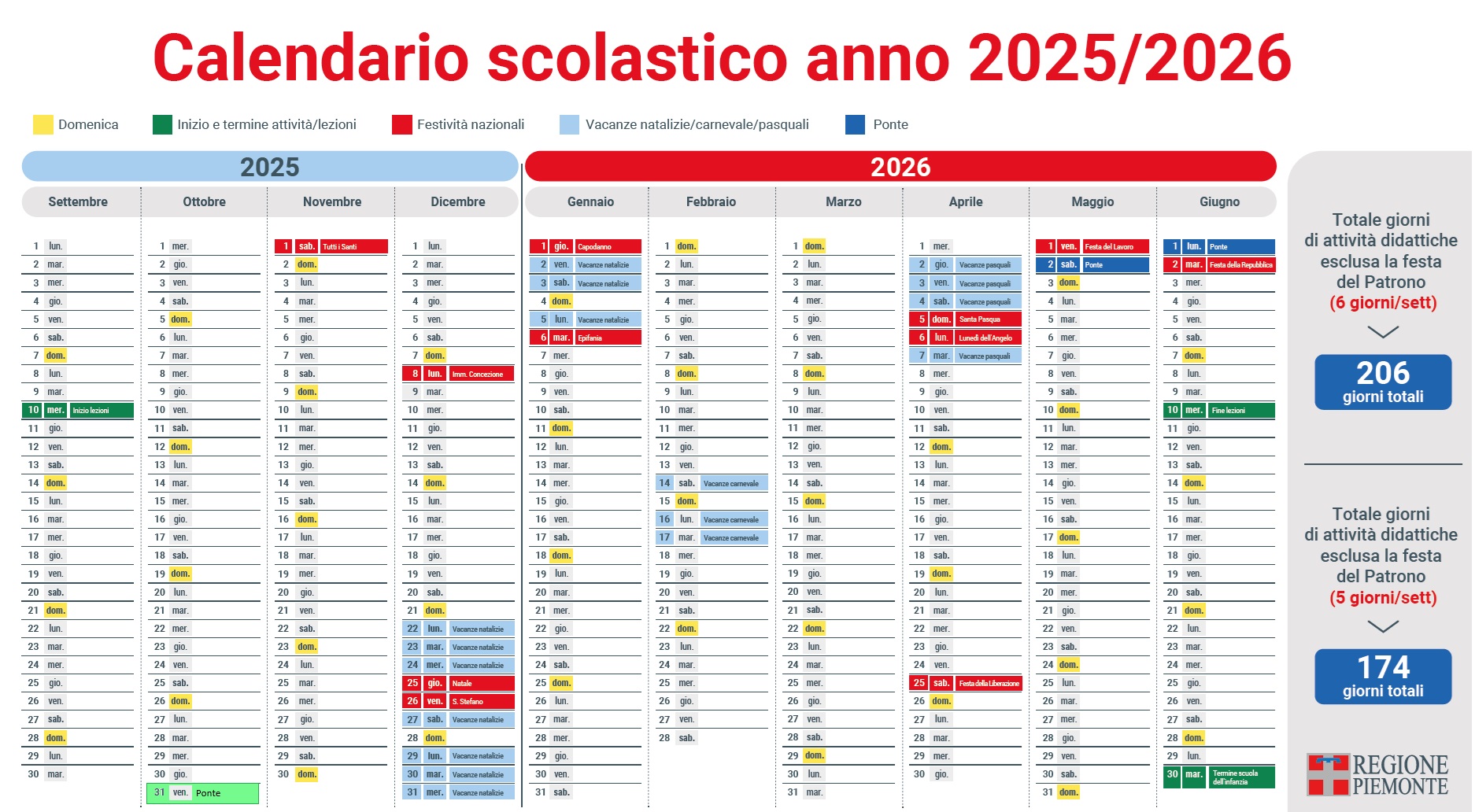 Le lezioni nella scuola primaria e nella scuola secondaria di primo e di secondo grado in Piemonte si svolgeranno da mercoledì 10 settembre 2025 a mercoledì 10 giugno 2026, per un totale di 206 giorni negli istituti in cui le lezioni si tengono anche al sabato, mentre 174 sono i giorni per le scuole dove si resta in classe fino al venerdì. In considerazione del servizio svolto, le scuole dell'infanzia hanno facoltà di anticipare l'inizio dell'attività didattica, che terminerà martedì 30 giugno 2026.